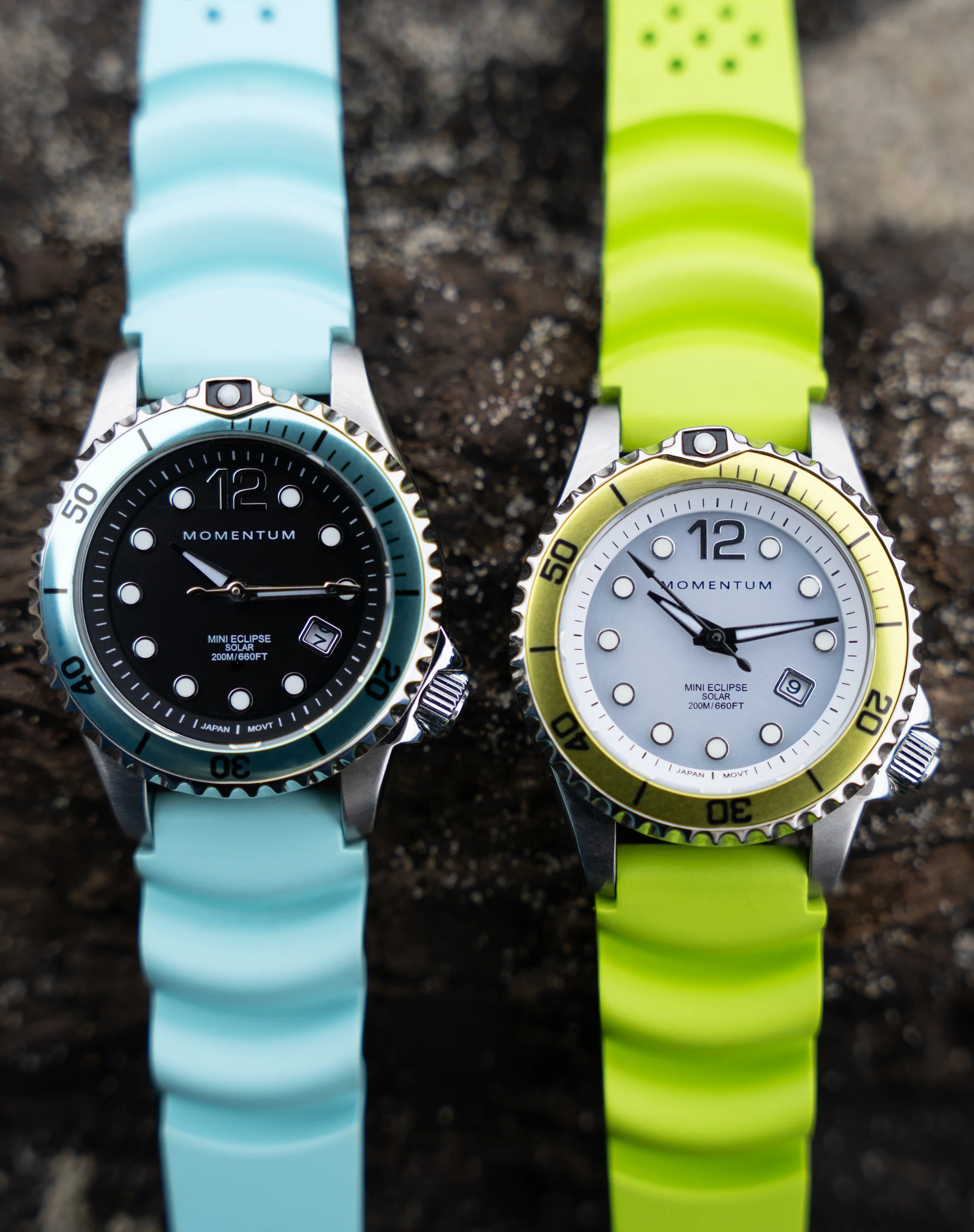 Add a splash of color to your everyday look with the Mini Eclipse Solar - a compact, fun, and functional watch designed to brighten your style without compromising performance. Behind its vibrant personality lies the soul of a true dive watch.